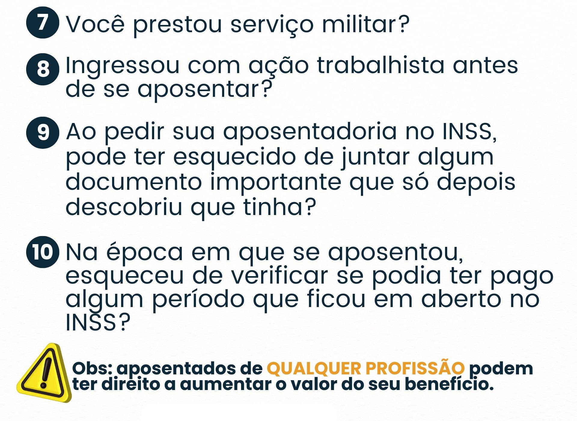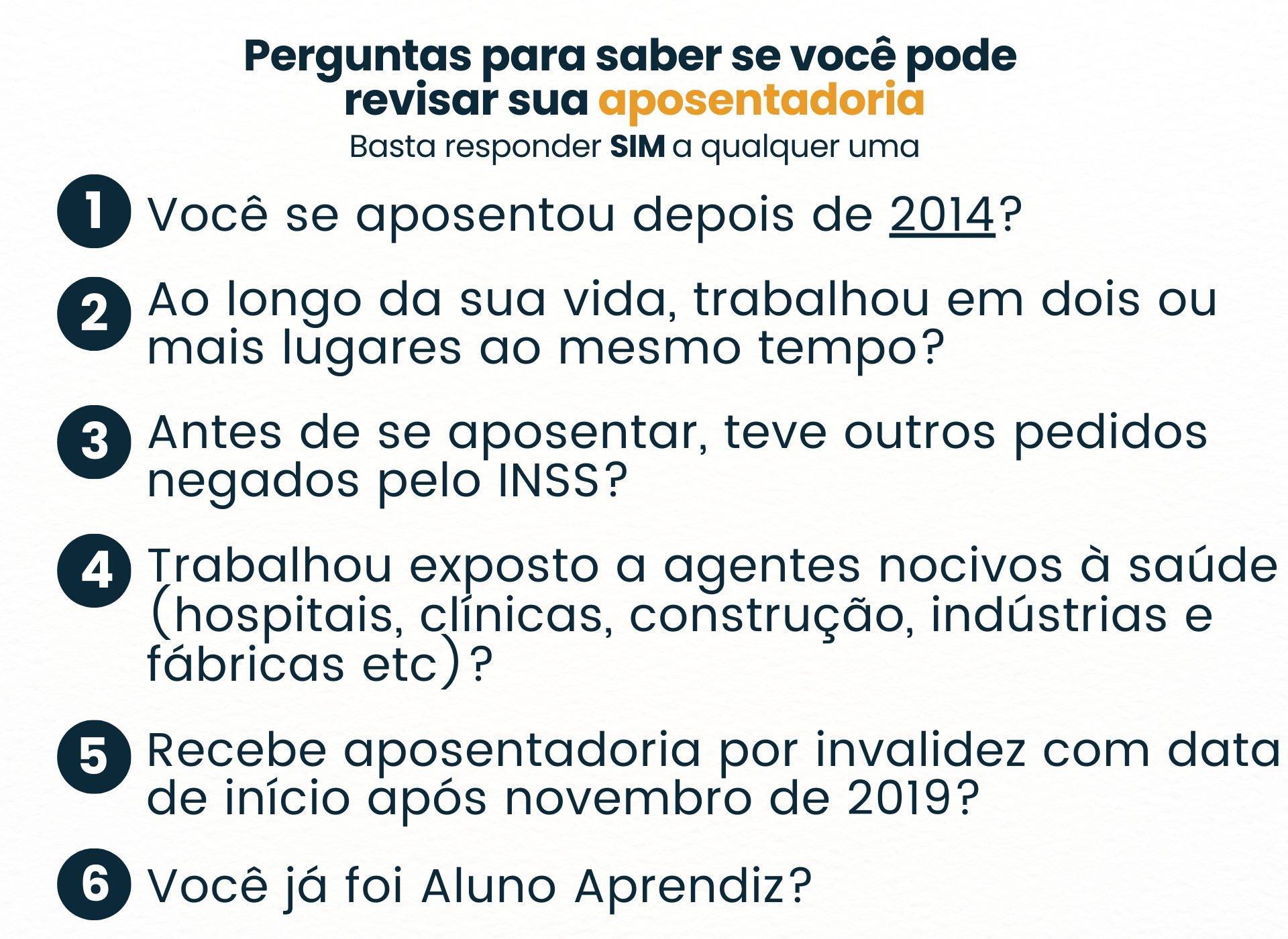O pedido em face do INSS poderá ocorrer para todos os benefícios previdenciários, sejam aposentadorias, auxílios, pensões etc. Mas, para facilitar no que diz respeito às aposentadorias, é importante o segurado se fazer algumas perguntas básicas, que podem direcioná-lo ao profissional da advocacia, para que uma análise mais apurada do seu direito de revisão possa ser feita. Acompanhe: